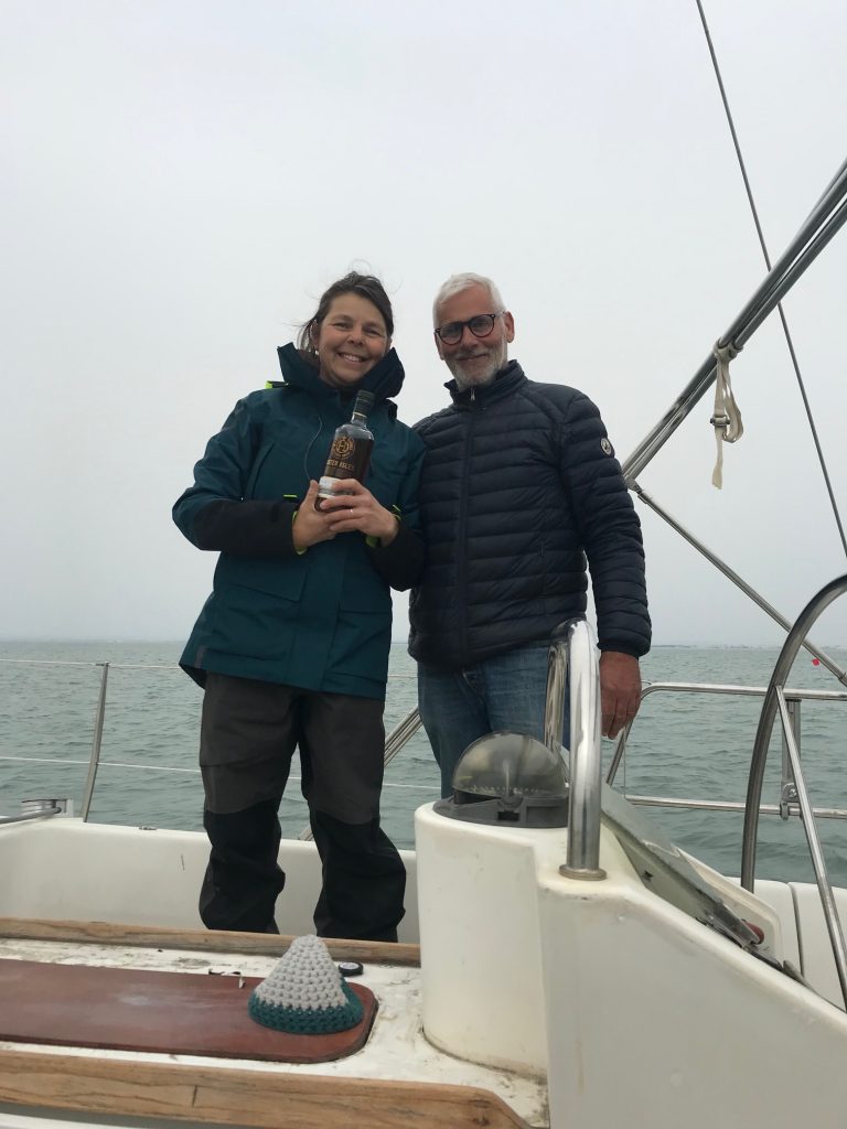 Personne ne s’étonnera si je vous dis que nous avons préféré le rhum à l’eau bénite : nous débouchons une bouteille d’un excellent Sister Isles en demandant à Poséidon qui règne sur les mers de prendre soin d’Aleph, puis à Eole, dieu venteux, de devenir ami avec notre voilier, enfin à tous deux d’accompagner notre Odyssée de leur bienveillance. Une rasade de rhum dans les vagues pour Poséidon, une giclée en l’air pour Eole et une coulée sur la plage arrière de notre voilier ; il manquait le signe de croix, le bon Dieu ne nous en tiendra pas rigueur. Nous complétons notre rituel d’une gorgée de rhum. Le pacte est scellé : nous avons bu avec les dieux, puissent-ils s’en souvenir et toujours nous protéger.