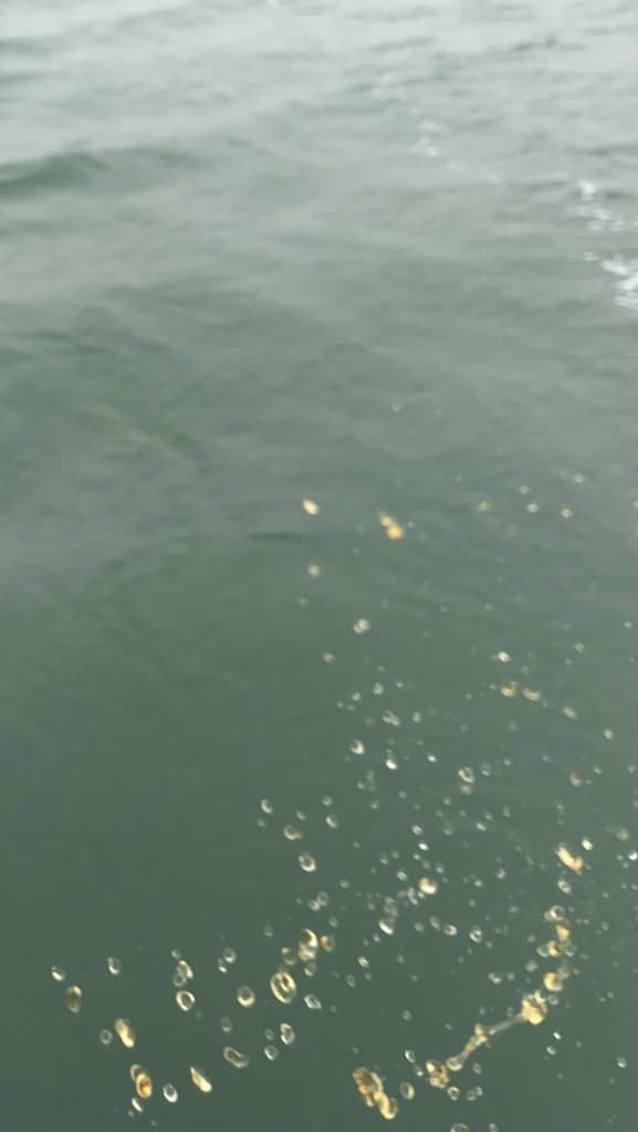 Aujourd’hui, nous allons baptiser notre voilier qui navigue pour la première fois sous son nouveau nom : Aleph. Nous naviguons dans une houle ample et généreuse et un ciel brumeux estompe l’horizon : le soleil pourtant tout proche a peine à percer. La mer hésite entre le gris clair et le vert, un vent discret effleure les voiles. Le moment est propice ! Cette lenteur tranquille nous invite aux ablutions baptismales.