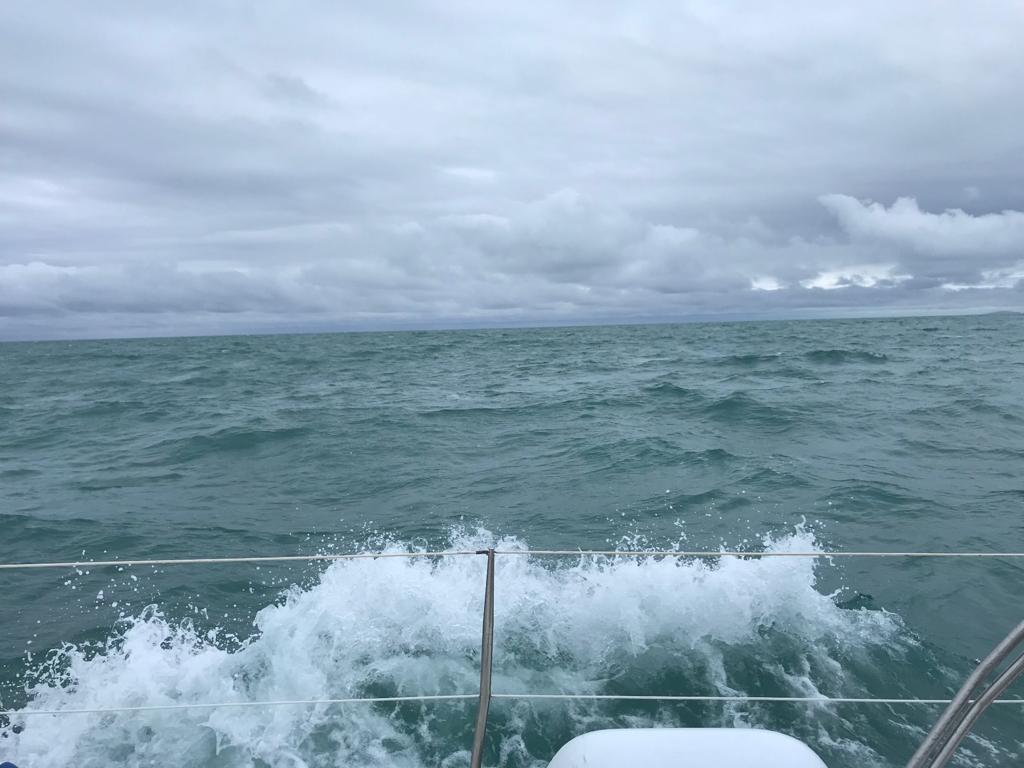 Dans mon ciré jaune je n’ai rien d’autre à faire que de contempler cet horizon, en réchauffant mes doigts mouillés au creux de mes paumes, à peine nauséeuse dès que je ferme les yeux. Alors je les garde grand ouverts et laisse divaguer mon esprit au-dessus de cette fine ligne, interface entre le vert bleu de l’eau mouvante et le gris sombre de l’air.