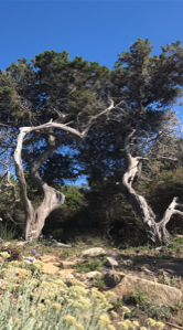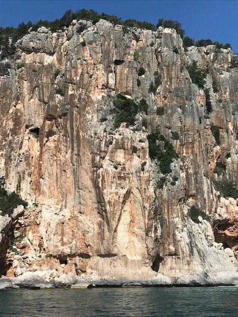 L’eau turquoise lèche de sa houle les pieds des titans de calcaire tantôt rouges et chargés de fer, tantôt blancs, éblouissant de lumière. Cette roche verticale délimite la partie la plus sauvage de la Sardaigne, où nulle route, nulle habitation, nul être humain n’a sa place. Quelques arbres rachitiques cramponnent leurs racines aux anfractuosités, tordus par les vents violents, nourris par les faibles pluies. La vie est bien entêtée, rien ne l’empêchera jamais de se reproduire !