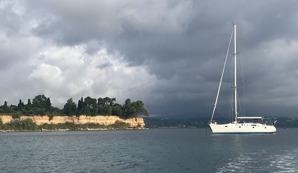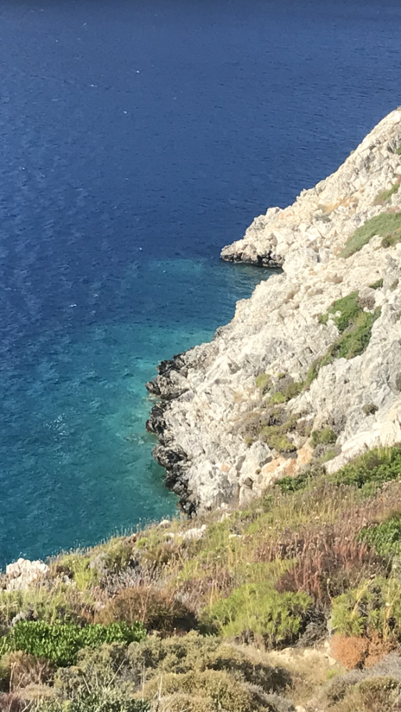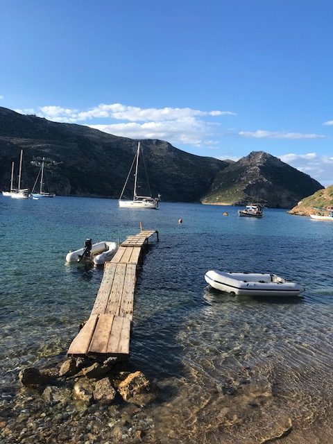 Aleph vogue sur les eaux ioniennes : leur bleu se teinte imperceptiblement d’un mauve violacé au creux de la houle, couleur singulière baptisa jadis cette mer (« ios » signifie violet en grec). Nous quittons la baie de Pylos pour longer les côtes du Péloponnèse en direction du Sud. L’ancre est jetée à Methoni où, à l’ombre des mûriers, nous partageons un repas avec Sylvain que je revois après une quinzaine d’années & Isabelle, puis arrivons au mouillage dans la baie de Koroni surplombée d’une ancienne forteresse vénitienne. Au nord en direction de Kalamata l’horizon s’assombrit et nous voyons arriver les nuages de pluie sur nous : grondements de tonnerre résonnant sur l’eau, pluie diluvienne et un arc-en-ciel vif et éphémère en bouquet final. Le lendemain Aleph file en direction du cap Tenare, à la pointe du Magne, l’endroit le plus au Sud de l’Europe continentale; un vent puissant et soudain nous attend derrière le cap et nous entraine avec lui jusqu’à Porto Kagio : une crique sauvage, ronde comme le ventre d’une mère qui nous protègera des colères éoliennes pour la nuit. Alors que nous pénétrons au paradis, les rafales mollissent et l’eau s’émancipe peu à peu de la houle du large. Aleph tourne, docile au bout de son ancre pour mettre son nez au vent et face à nous apparaît un chemin griffé dans le flanc de la colline : une invitation à une échappée terrestre qui ne se refuse pas !