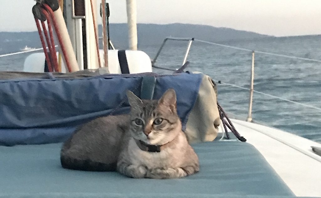 Puis Didier me dit « tu remontes au vent ». Entouré des rafales sifflantes du cap et du vent qui se cabre, Aleph gite fort mais avance droit ; j’obéis à l’ordre et remonte au vent. Le souci, c’est que ce n’était pas un ordre mais une constatation. Un encouragement à faire l’opposé exact : ne pas remonter au vent. Donner du tribord au lieu du bâbord que j’offre généreusement à Aleph, qui tout joyeux de mettre enfin son museau dans le vent (cela calme n’importe quel voilier) continue hélas dans sa lancée grâce à ma poigne un peu tremblante et effectue, sous l’ordre d’un moussaillon écervelé, un virement de bord tout à fait incongru. Inutile de vouloir le rattraper quand je comprends l’erreur : Aleph est lancé et effectue 180° de rotation face au cap pour se retrouver déventé et non optant dans les rafales qui montent de plus en plus. Ce brusque cabrage a jeté une partie de nos livres à terre, précipité la pauvre Kalisto apeurée une fois de plus sous ses coussins et secoué toutes nos casseroles.