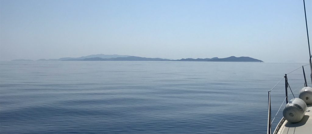 Les mouettes nagent près de nous, incapable de planer dans cette absence flagrante de vent et c’est à peine si nous les dérangeons. Nous renonçons aux voiles et avançons au moteur sur une nappe d’huile épaisse et silencieuse que recouvre une brume de chaleur : l’horizon est indistinct, paysage en ombres chinoises, îles et îlots dont les silhouettes se superposent dans des camaïeux gris du début de la journée.